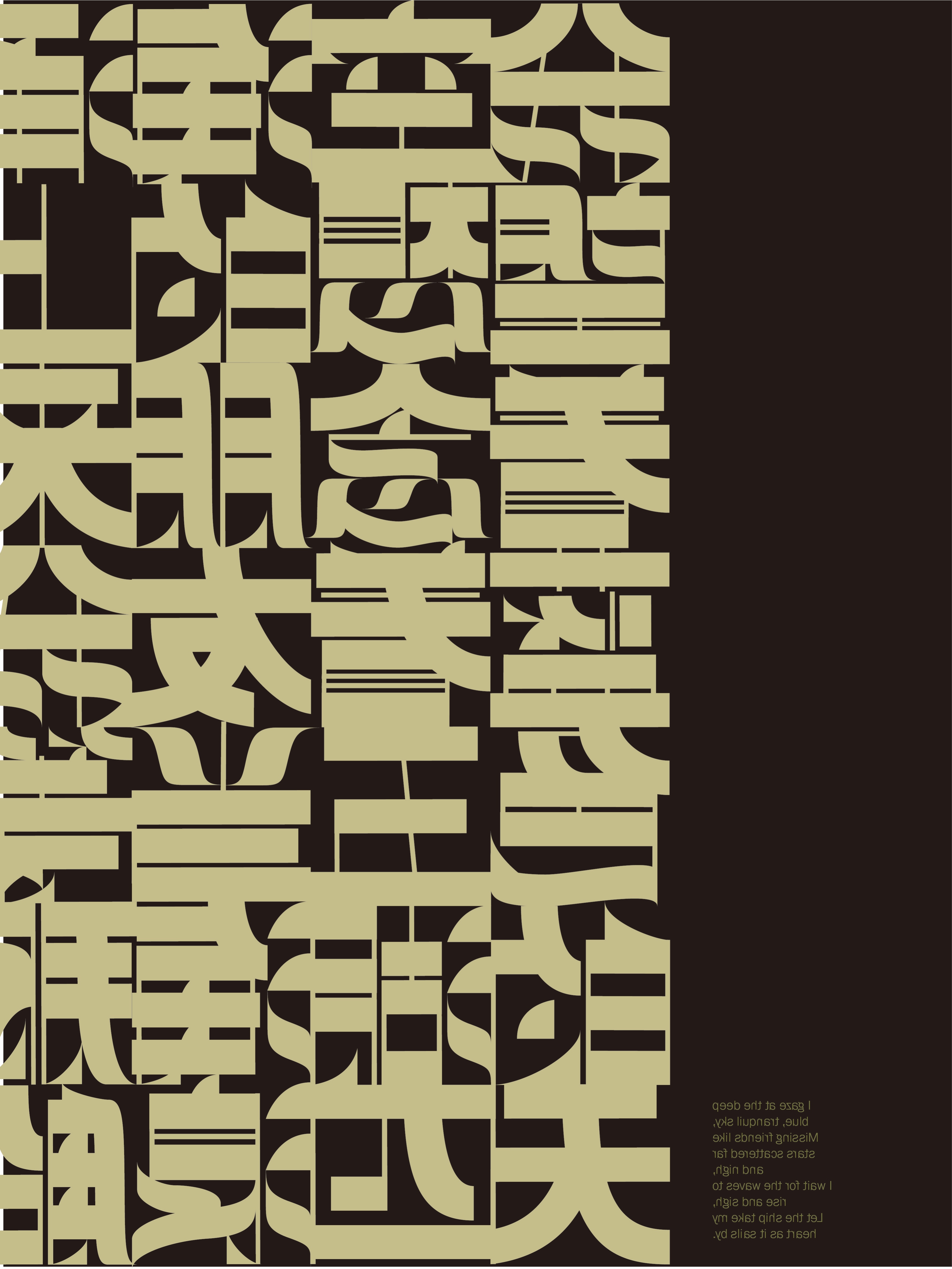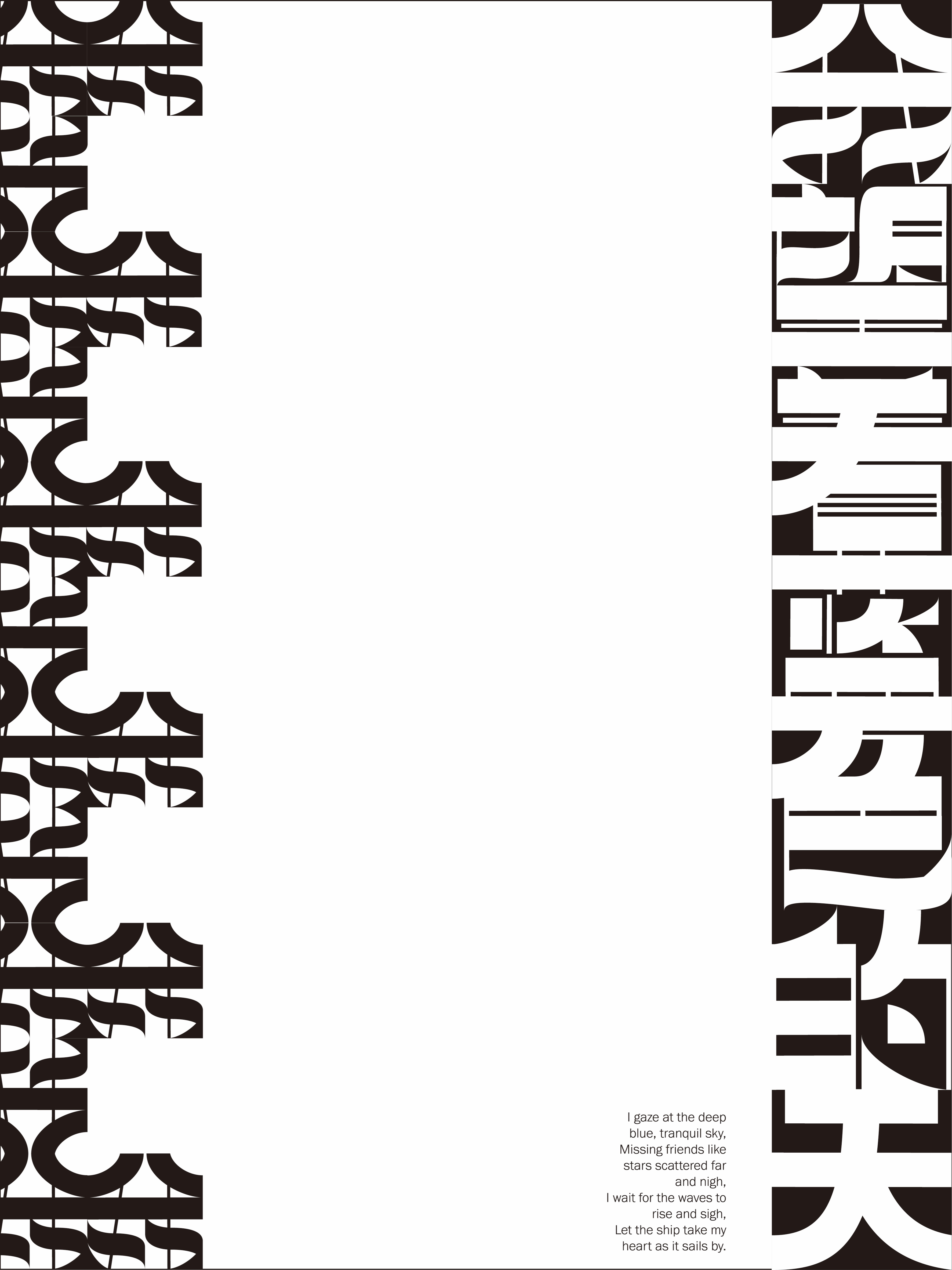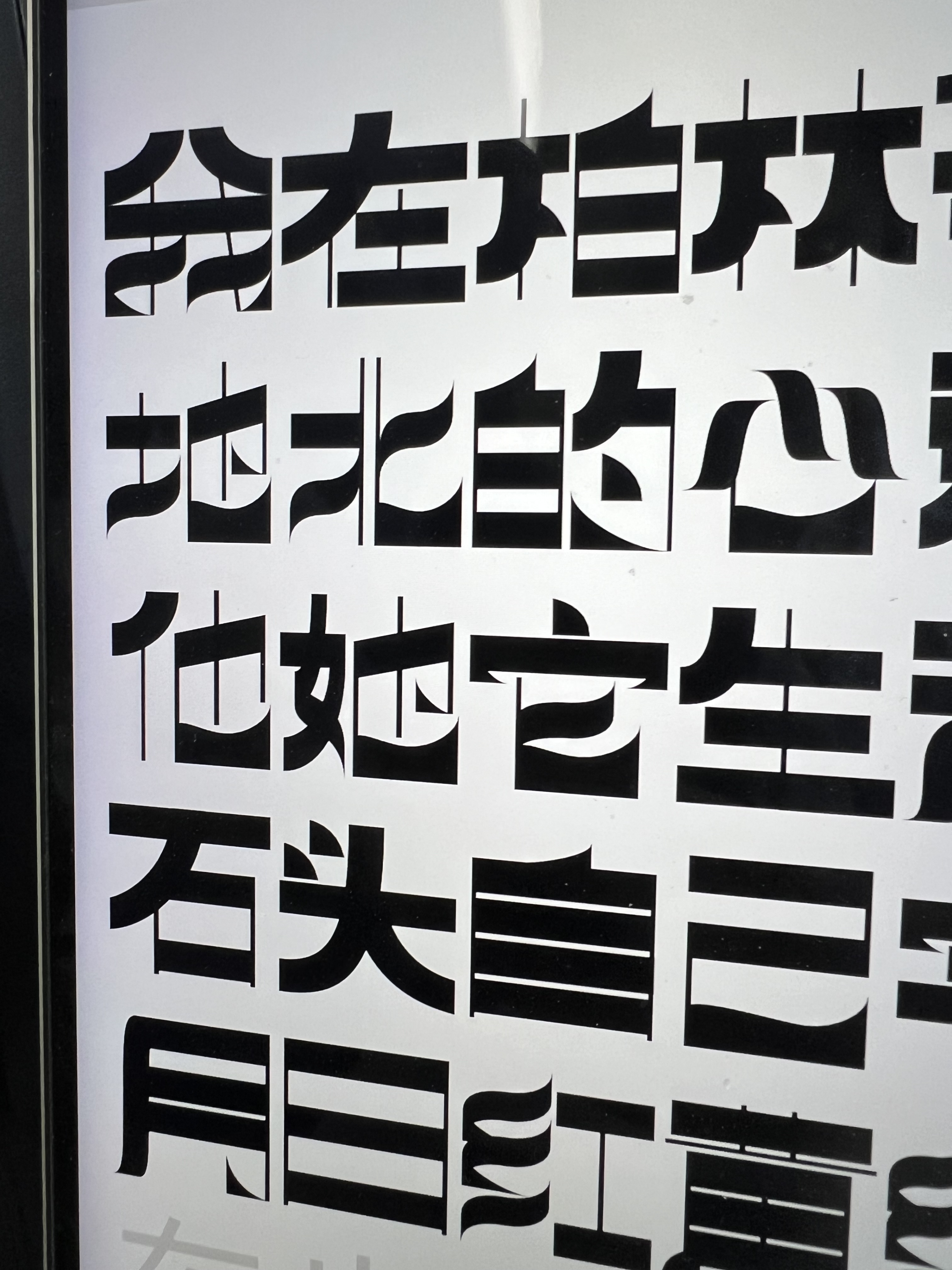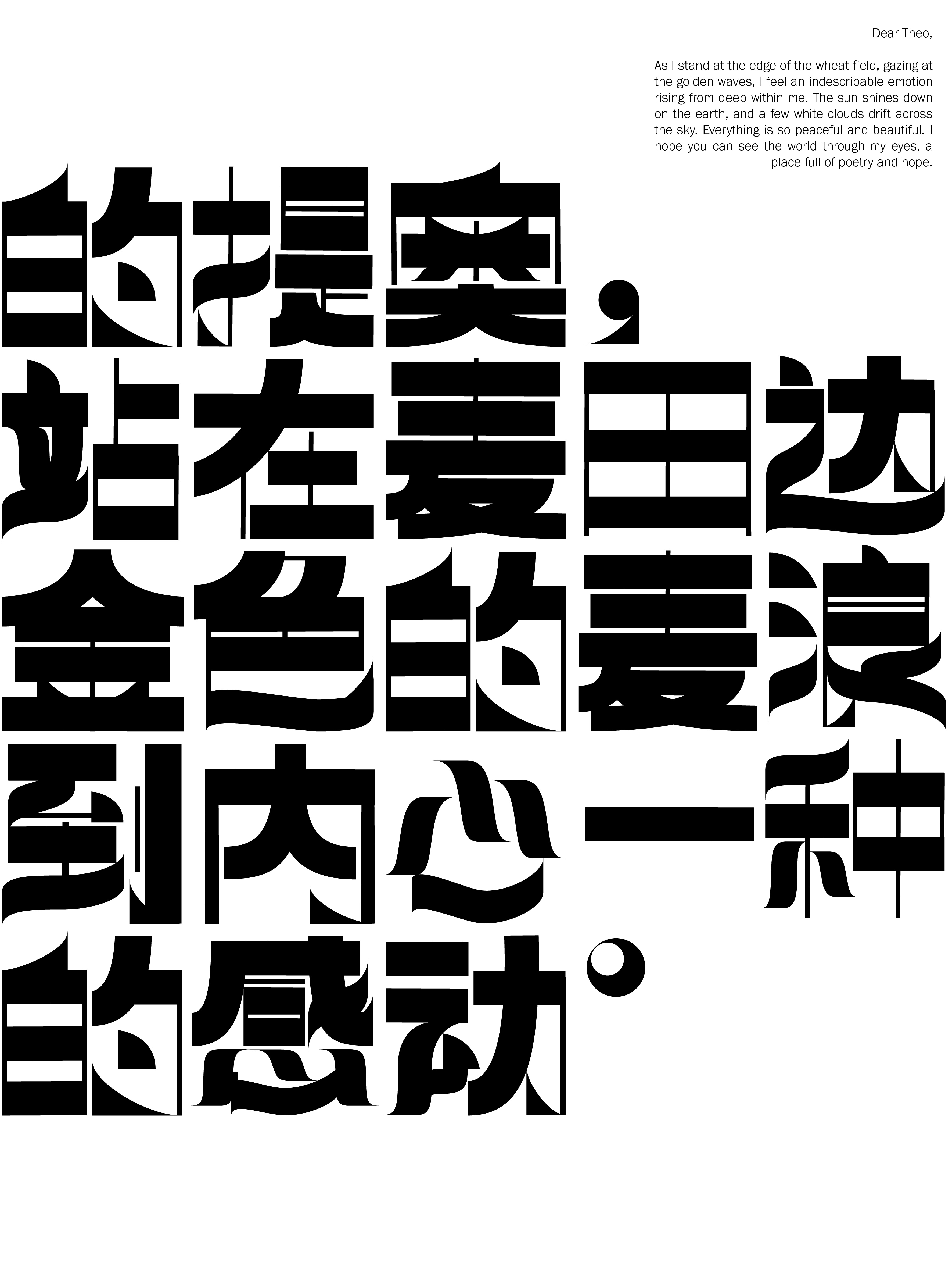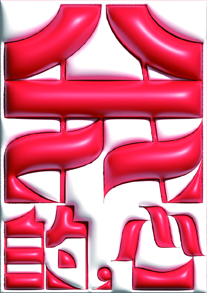 Diese Schrift basiert auf rechteckigen und modifizierten geometrischen Formen und erzeugt ein starkes geometrisches Gefühl, das die traditionellen Schwünge und Betonungen der chinesischen Kalligraphie abschwächt und neue Möglichkeiten für das Schreiben chinesischer Schriftzeichen erkundet. Jedes Zeichen ist wie ein Baustein, der durch Zusammenfügen eine einzigartige visuelle Wirkung entfaltet.
